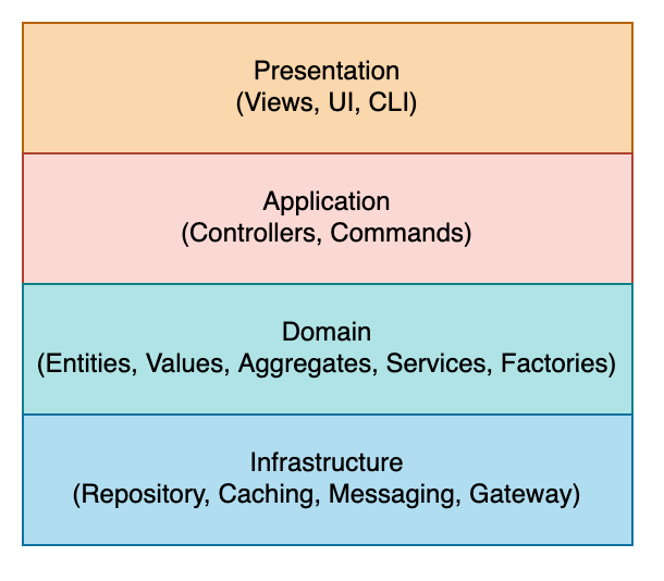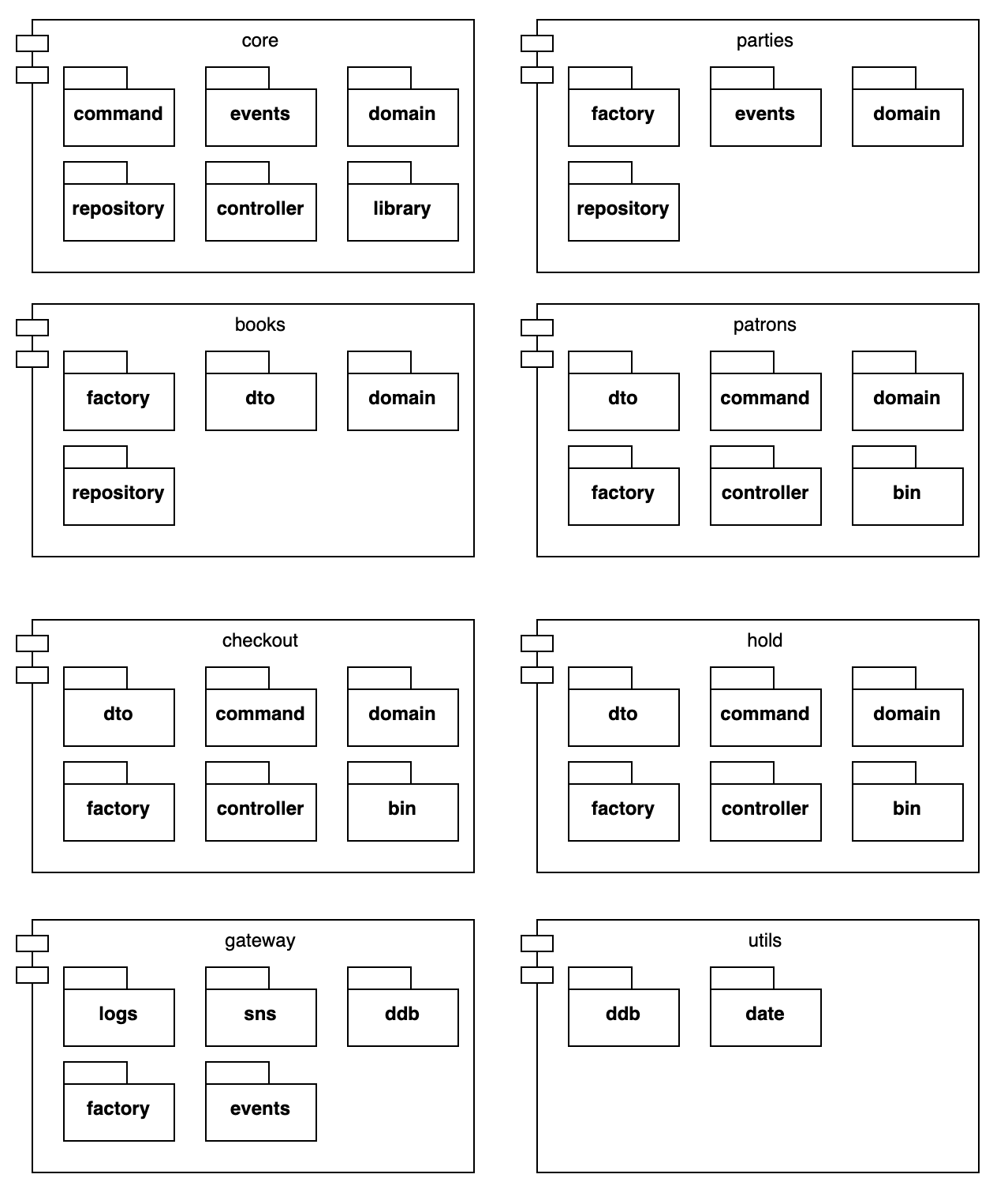 The library management application divides the application into multiple domains such as patrons, catalog, checkout and hold. Each domain then divides into following layers: