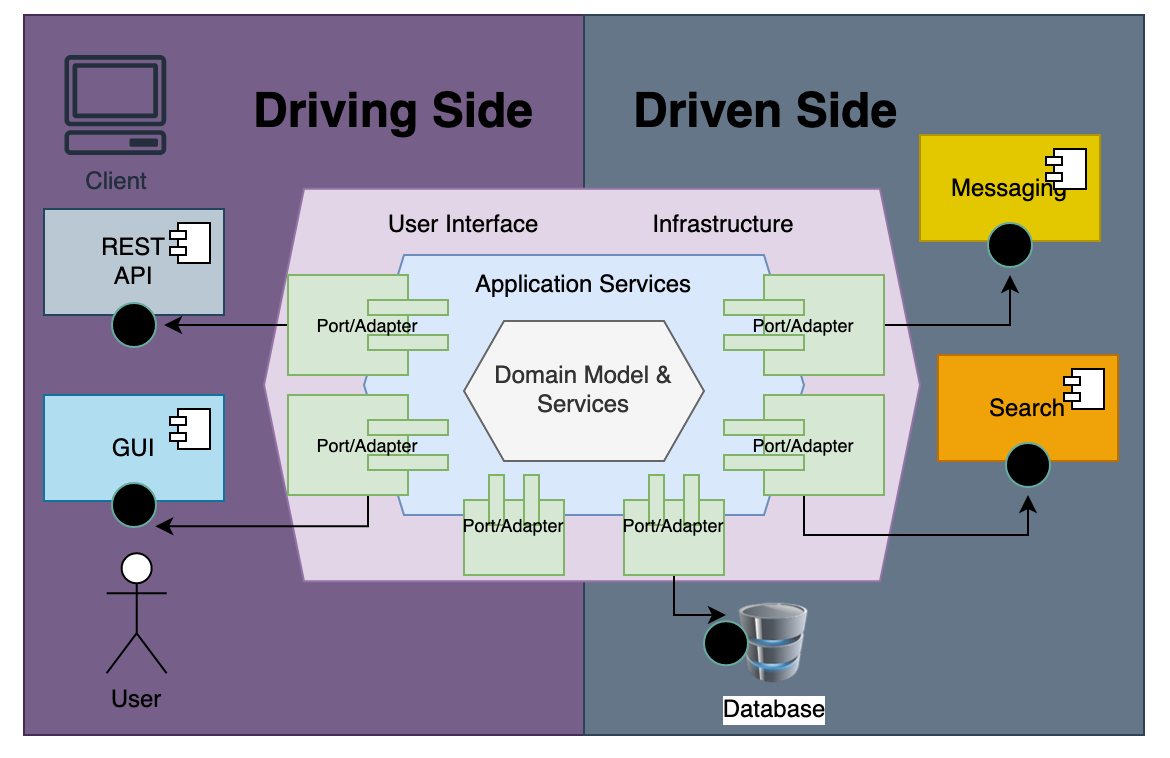 The port uses a protocol or an application program interface (API) for communicating with the application, which is then translated by the adapter for internal consumption. When the application needs to connect to external systems such as database, it goes through similar port or interface and is then translated into underlying database protocol by the adapter. This architecture essentially uses Dependency Inversion and Inversion of control Principles by only depending on the ports and decoupling external and internal components from the implementation technology. The application is the core of the system that defines use-cases that can be triggered by CLI or UI. The application layer internally contains commands, handlers and services, which receives commands or queries from ports and communicates with external systems via ports and adapters. The application layer may trigger application events as an outcome of a use-case. The domain layer defines domain model and domain specific services, which are used by the application layer. The driver or primary side in hexagonal architecture allows users to initiate communication with the application core and the driven or secondary side within the application core initiates communication with external dependent systems.